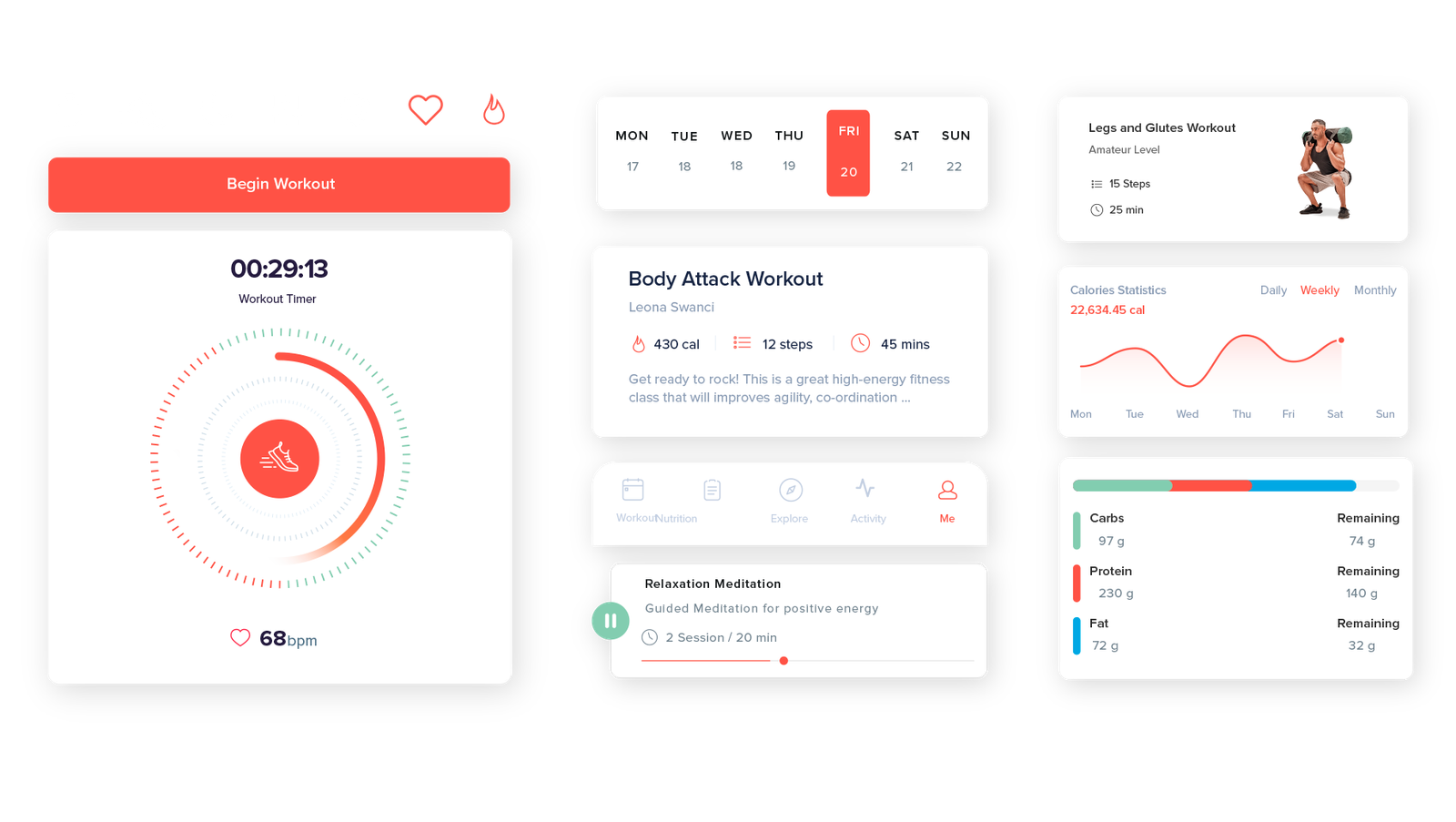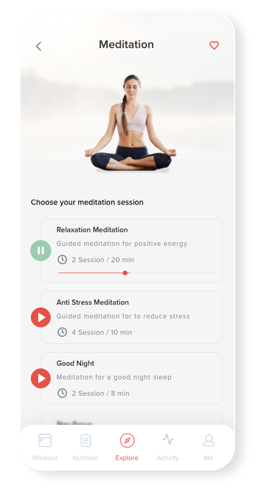 The challenge was unifying these diverse functions into a cohesive, visually appealing product that could compete with established apps like Centr, Calm, and Sweat. I designed a clean, intuitive UI that made features e ortless to use, with a minimalist aesthetic that reflected the brand’s calming philosophy and kept the experience simple and engaging.